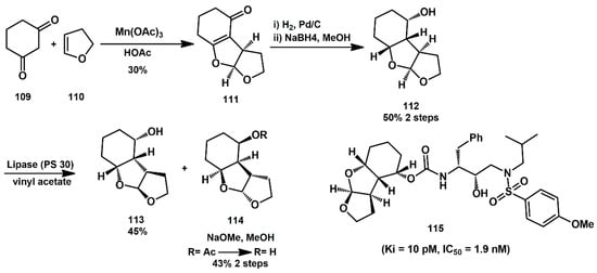Starting from 1,3-diketone 109, reaction with dihydrofuran 110 in the presence of Mn(OAc)3·2H2O afforded the corresponding tricyclic derivative 111 (Scheme 23). Enone 111 was first hydrogenated, and the resulting ketone was reduced with NaBH4, to give racemic endo alcohol 112. This racemic alcohol was subjected to enzymatic resolution using lipase PS-30, which provided the optically active acetate derivative 114 (45%yield) and alcohol 113 (45% yield). Acetate 114 was converted back to the alcohol 113 in 89% yield by transesterificaton using NaOMe in MeOH. A series of ligands was prepared and incorporated into new inhibitors. Notably, compound 115 exhibited very impressive enzyme and antiviral potency (Ki = 10 pM, antiviral IC50 = 1.9 nM).