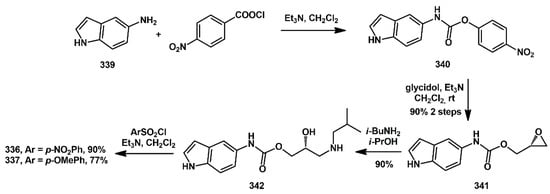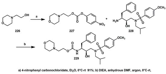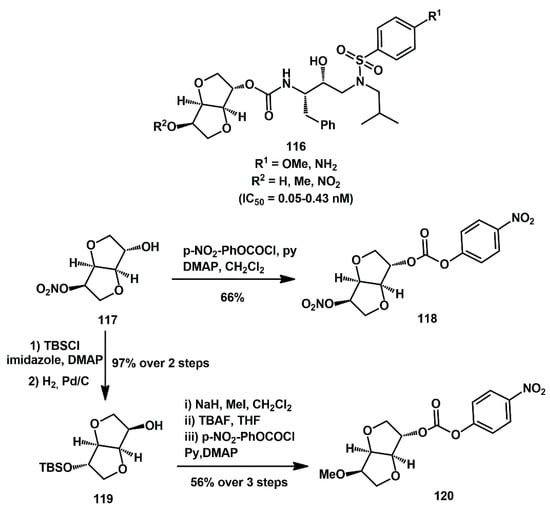Novel isosorbide scaffolds were proposed by Liu as P2 ligands of HIV-1 protease inhibitors bearing the hydroxyethylamine core 116 (Scheme 24) []. They showed very high inhibition activity with IC50 in the nanomolar or picomolar range. From a preparative perspective, they leveraged the commercial availability of starting isosorbide mononitrate 117, which was easily elaborated and activated as a mixed carbonate. Specifically, it was transformed into mixed carbonate 118 with p-NO2PhOCOCl in good yield or converted into TBS-protected alcohol 119 via TBS ether formation, followed by cleavage of nitrate under reductive conditions. The alcohol was then methylated; the TBS group was cleaved, and final carbonate formation afforded the key intermediate 120.