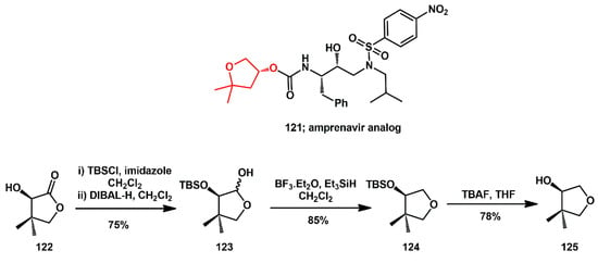 Chiral 4,4-dimethyltetrahydrofuran-3-ol was prepared by Srinivasa Reddy and used for the synthesis of new amprenavir analogs []. Starting from pantolactone 122 (Scheme 25), which is available in both enantiomeric forms, lactol 123 was obtained by protection and reduction. Subsequent reduction with BF3Et2O and triethylsilane, followed by final deprotection with TBAF, afforded the desired THF-alcohol.