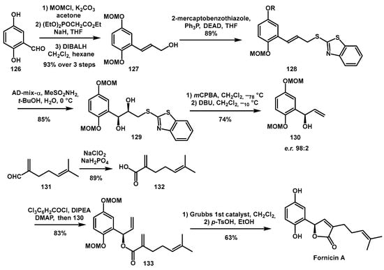 Different O-heterocycles were also proposed by Yajima as HIV-1 protease inhibitors []. Fornicin A, a meroterpenoid with a γ-butylolactone moiety in its side chains showed weak anti-HIV-1 protease activity without cytotoxicity against E-PR293 cells. The synthesis involved the preparation of optically active alcohol 130 from the starting material 2,5-dihydroxybenzaldehyde 126 (Scheme 26), using Sharpless asymmetric dihydroxylation on the suitable benzothiazolsulfide 129 as the key step. Oxidation with mCPBA and a final Smiles rearrangement of β-hydroxysulfone yielded the desired alcohol 130, which was coupled with the suitable acid segment prepared from the known aldehyde 131. Ring-closing metathesis using Grubbs 1st catalyst and a final deprotection step furnished Fornicin A.