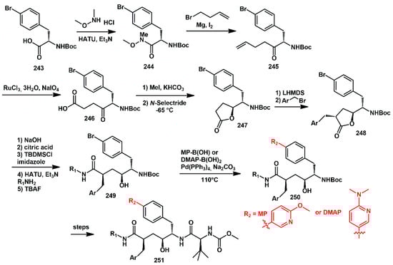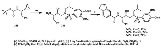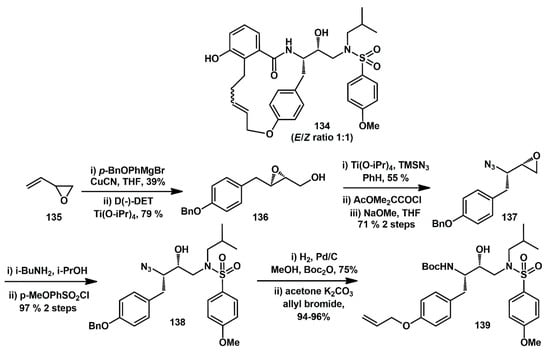 Flexible macrocycles between the P1′-side chain and a suitable P2′-ligand were proposed by Ghosh to broaden the activity of the inhibitor by achieving a better fit in the S2 hydrophobic pocket, which increases in size upon certain mutations []. New inhibitors bearing 16- to 19-membered macrocyclic rings, connecting a nelfinavir-like P2 ligand and a tyrosine side chain containing a hydroxyethylamine sulfonamide isostere, were synthesized and found to be more potent than their corresponding acyclic counterparts. In particular, compound 134 showed the best enzyme inhibitory and antiviral activity (Ki = 0.2 nM, IC50 = 0.21 mM) (Scheme 27). The synthesis of the desired tyrosine-derived hydroxyethylamine sulfonamide isostere 138 began with butadiene monoxide 135, which was transformed into the corresponding allylic alcohol. This was subjected to Sharpless asymmetric epoxidation, and the resulting epoxide 136 was regioselectively opened by TMSN3/Ti(O-iPr)4 system to afford the corresponding azido diol, which was subsequently converted to epoxide 137. After introducing the sulfonamide moiety, a Boc-protected amine and a free phenol were formed in one pot process via catalytic hydrogenation in the presence of Boc2O. Finally, the introduction of an allyl chain furnished the desired intermediate 138.