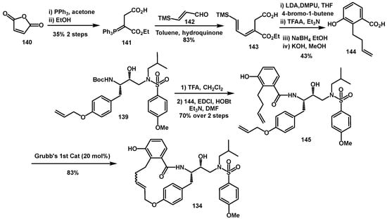 The P2 fragment was synthesized as 3-hydroxy-2-alkenylbenzoic acid from maleic anhydride 140 via formation of phosphorane 141, followed by Wittig reaction with known aldehyde 142. The resulting dienoic acid was then alkylated and subjected to 1,6-electrocyclization by exposure to TFAA/Et3N, followed by reduction with NaBH4 (Scheme 28). Final saponification yielded the desired benzoic acid 144. After amine deprotection and coupling with the benzoic acid, the resulting acyclic diene was subjected to ring-closing metathesis (RCM) with Grubbs’ 1st generation catalyst, furnishing the desired macrocycles.