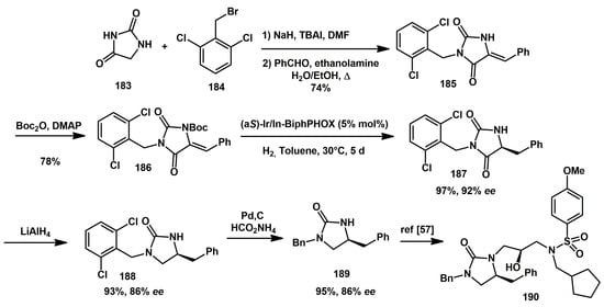 - Cai, Z.R.; Cho, A.; Buenrostro, A.Z.G.; Han, X.; Jabri, S.Y.; McFadden, R.; Qi, Y.; Voigt, J.; Yang, H.; Xu, J.; et al. Preparation of 1-Benzyl-2-imino-4-phenyl-5-oxoimidazolidine Derivatives as HIV Protease Inhibitors. WO2019075291, 18 April 2019. [Google Scholar]