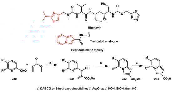 - Tukulula, M.; Klein, R.; Kaye, P.T. Indolizine Studies, Part 5: Indolizine-2-carboxamides as Potential HIV-1 Protease Inhibitors[1]. Synth. Commun. 2010, 40, 2018–2028. [Google Scholar] [CrossRef]