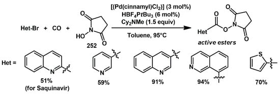 - de Almeida, A.M.; Andersen, T.L.; Lindhardt, A.T.; de Almeida, M.V.; Skrydstrup, T. General Method for the Preparation of Active Esters by Palladium-Catalyzed Alkoxycarbonylation of Aryl Bromides. J. Org. Chem. 2015, 80, 1920–1928. [Google Scholar] [CrossRef]