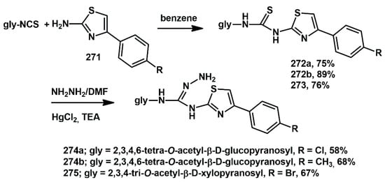 - Chen, H.; Zhao, Y.; Cao, L. Synthesis and Bioactivity of N-glycosyl-N′-(4-arylthiazol-2-yl) Aminoguanidines. J. Chin. Chem. Soc. 2010, 57, 1085–1090. [Google Scholar] [CrossRef]