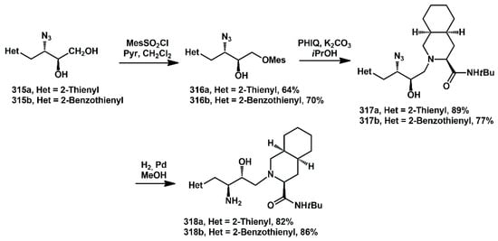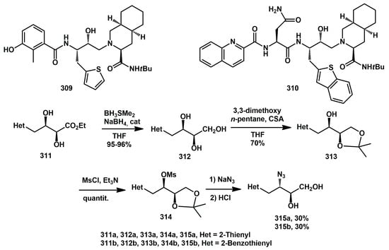- Bonini, C.; Chiummiento, L.; De Bonis, M.; Di Blasio, N.; Funicello, M.; Lupattelli, P.; Pandolfo, R.; Tramutola, F.; Berti, F. Synthesis of New Thienyl Ring Containing HIV-1 Protease Inhibitors: Promising Preliminary Pharmacological Evaluation against Recombinant HIV-1 Proteases. J. Med. Chem. 2010, 53, 1451–1457. [Google Scholar] [CrossRef]