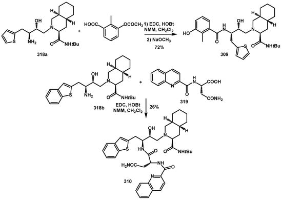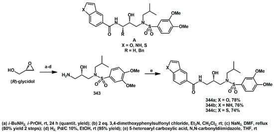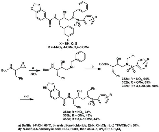 - D’orsi, R.; Funicello, M.; Laurita, T.; Lupattelli, P.; Berti, F.; Chiummiento, L. The Pseudo-Symmetric N-benzyl Hydroxyethylamine Core in a New Series of Heteroarylcarboxyamide HIV-1 Pr Inhibitors: Synthesis, Molecular Modeling and Biological Evaluation. Biomolecules 2021, 11, 1584. [Google Scholar] [CrossRef] [PubMed]