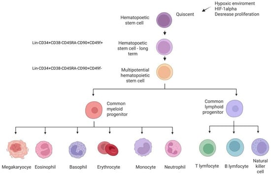 | Lin− CD34+ CD38+ | In HSCs, expression of CD38 is correlated with increased differentiation | BM and peripheral blood | [42] |