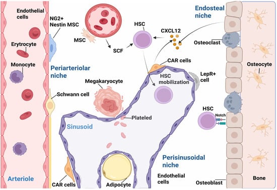 - Kandarakov, O.; Belyavsky, A.; Semenova, E. Bone marrow niches of hematopoietic stem and progenitor cells. Int. J. Mol. Sci. 2022, 23, 4462. [Google Scholar] [CrossRef] [PubMed]