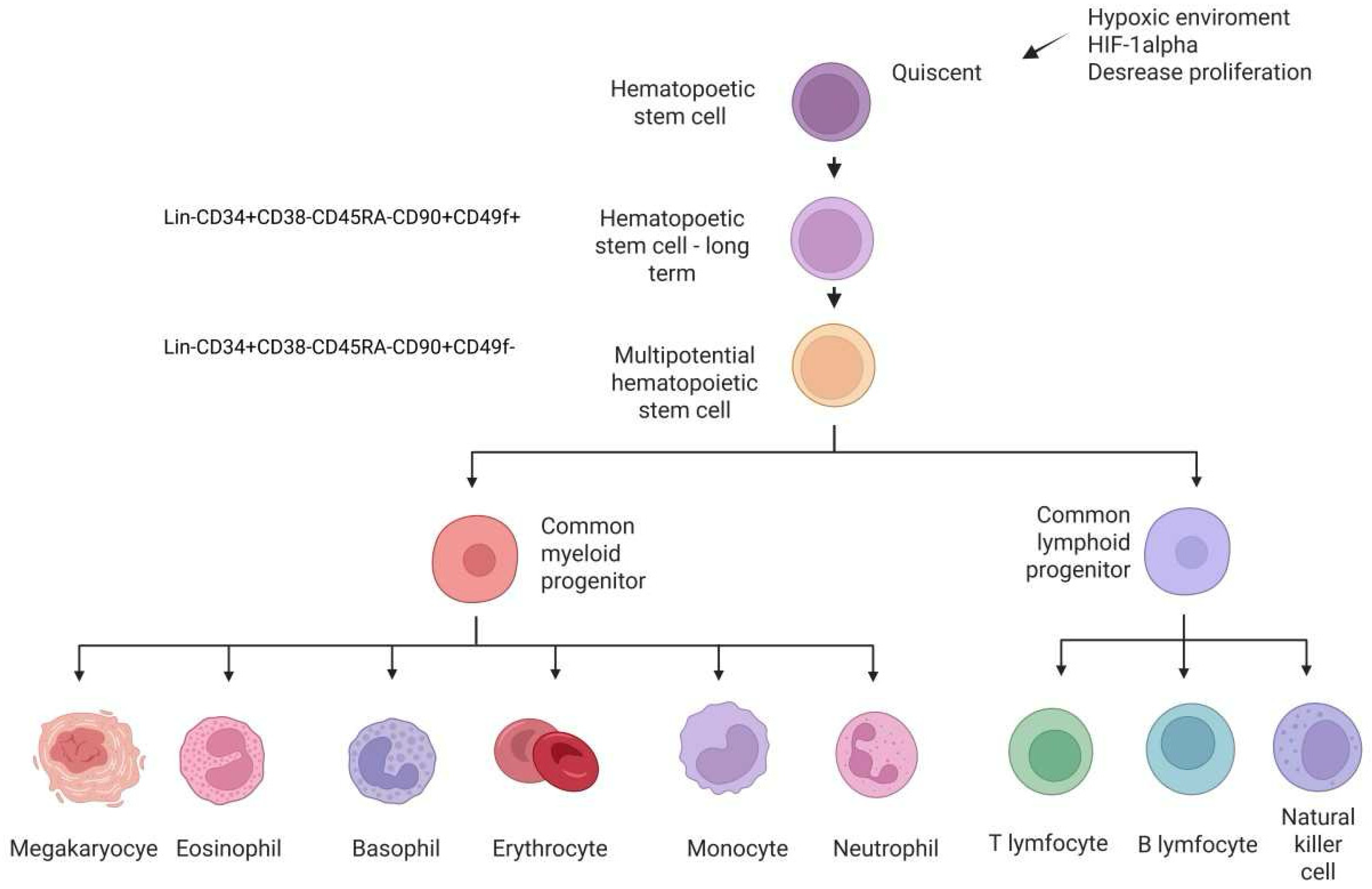 Lin− CD34+ CD38− CD45RA− CD90+ CD49f+ | Long-term repopulating hematopoietic stem cells | BM and cord blood | [22] |