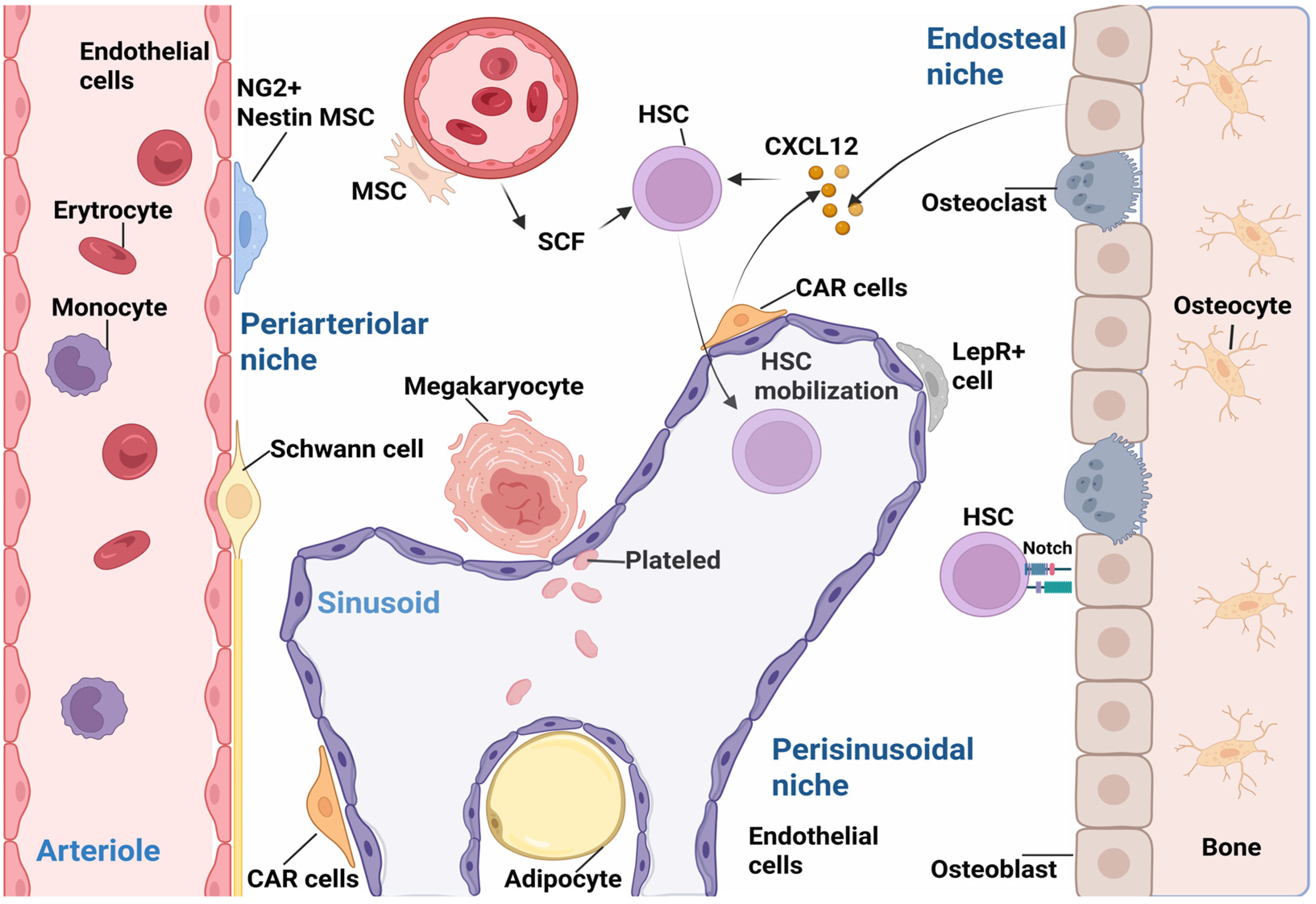 LepR+ cells | LepR co-expresion CXCL12 | Influence quiescence of HSCs | [87] | |