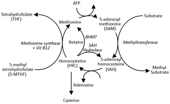 Methylation reactions are catalysed by methyltransferases and release S-adenosylhomocysteine (SAH or AdoHC). SAH is a competitive inhibitor of MTases and is hydrolysed by adenosylhomocysteinase (AHCY) to homocysteine (Hcy). This reaction is reversible, meaning that increased Hcy levels can lead to the accumulation of SAH, which can bring about a lower methylation capacity. This can be represented as the SAM/SAH ratio []. Homocysteine is re-methylated to regenerate methionine using 5-methyltetrahydrafolate (5-MTHF) or betaine via betaine homocysteine methyltransferase (BHMT) []. 5-MTHF, produced from dietary folate (dihydrofolate) through the folate cycle, donates a methyl group, catalysed by methionine synthase (MTR) using vitamin B12 (cobalamin, Cbl) as its cofactor []. These steps all form part of what is called the methyl cycle (Figure 1) []. The essential nutrients driving this cycle are thus methionine, folic acid (for CH3-THF), and choline (to generate betaine).