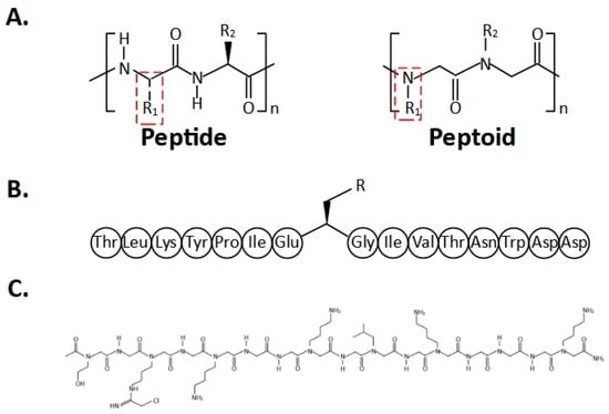 Specifically to improve peptide-based inhibitors, one possibility is to replace the peptide backbone with peptide mimics, called peptoids or peptidomimetics (Figure 2). Peptide inhibitors suffer from poor stability and short half-lives due to proteolytic degradation. These peptoids consist of chains of N-substituted glycine residues, such that the side chain is on the nitrogen of the peptide backbone, instead of the α-carbon as in peptides. As a result of this difference, peptoids are less susceptible to degradation by hydrolysis, resulting in improved stability and longer half-lives as well as often having improved cellular permeability and bioavailability compared to their peptide analogues [,]. The success of this approach has been shown in the development of a peptidomimetic inhibitor against SETD3 [] and a peptoid inhibitor against PRMT1 []. Peptidomimetics targeting SETD3 were designed based on a 16-mer β-Actin peptide (residues 66–81) with the histidine at position 73 (H73) being replaced by a panel of methionine analogues, which acted as substrate competitive inhibitors offered varying degrees of inhibition, with selenomethionine being the strongest inhibitor. These molecules showed that a 3-carbon core side chain seemed to be the optimal length and that apart from methionine and selenomethionine, inhibition of SETD3 could also be achieved by β-Actin peptides containing homomethionine, S-methylcysteine, leucine, norleucine, norvaline, and aminobutyric acid []. A peptoid that targets PRMT1 was constructed covering the first 16 residues of histone H4 and the guanidine on arginine at position 3 (R3) was replaced with a chloracetamidine group as a warhead, which is well-known to modify cysteine and used to target PRMT1 via cysteine at position 101 (C101) found within the active site, that is not conserved in most other PRMT family members such that it could bring about selective and irreversible modification of PRMT1 [].