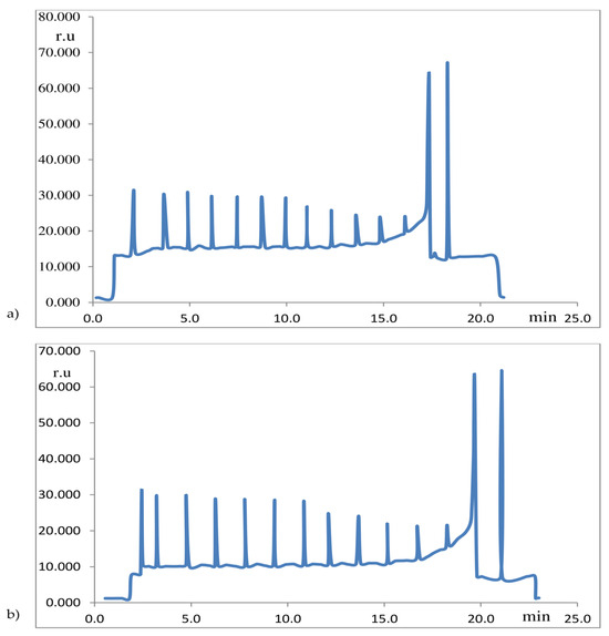 Computer-generated (based on the original graphical record of Chla fluorescence) unpublished examples of the modulated chlorophyll fluorescence method. Modulated Chla fluorescence curves in T. aestivum (L. cv. Kg-56) leaves, induced by repeated application of saturating light pulses, already illuminated by continuous actinic light, during drought stress. Abscissa: time (min.); Ordinate: fluorescence intensity (relative unit: r.u.). (Due to the limitations of the computer program for generating Chla fluorescence records, the time axis (abscissa) is directed opposite (from left to right) to the dynamics of the change in Chla fluorescence yield, which occurs from right to left). (a) Computer-generated record of modulated Chla fluorescence of wheat leaves after 1 day of drought; (b) Computer-generated record of modulated Chla fluorescence of wheat leaves after 4 days of drought. Examples of plant stress were detected by the modulated chlorophyll fluorescence method: altered Chla fluorescence yield was observed in leaves of wheat plants exposed to 4 days of drought (b), compared to leaves of the same plants in the initial stage of drought stress (a). A record of modulated Chla fluorescence equivalent to that recorded in references [18,19,21].