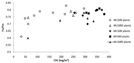 Relationship of total chlorophyll content (mg m−2) and quantum yield of RC PS2 (Fv/Fm) in young fully developed leaves of four- or six-week-old Z. mays plants. Created equivalent to reference No.: [22]. N—week; SSRI—plants in which the source–sink ratio increases; SSRD—plants in which the source–sink ratio decreases. NM: plants not exposed to SSRI, i.e. SSRD treatments.