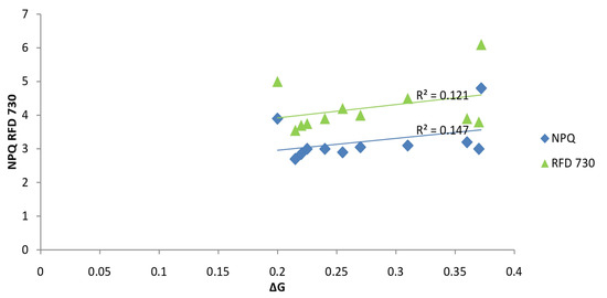 We later (Figure 3) tested the regression dependence of the non-photochemical fluorescence quenching parameter (NPQ) and the photochemical efficiency parameter (RFD 730) on the Gibbs free energy (ΔG0) and found a relatively weak regression dependence of these parameters of Chl a fluorescence of maize leaves on the total energetics of that plant in the late vegetative stage of development, at a physiologically low temperature for that species [24].
