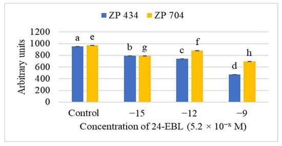 Effect of different concentrations of 24-EBL on total redox status of whole seedlings of ZP 704 and ZP 434 maize hybrids, determined using the EPR spectroscopy method. Created equivalent to reference No: [32]. The results are given in arbitrary units (r.u.) of the EPR signal, double integral values per sample mass. The axis values are displayed in ten thousands. Values indicated by the same letter are not statistically different (p < 0.05).
