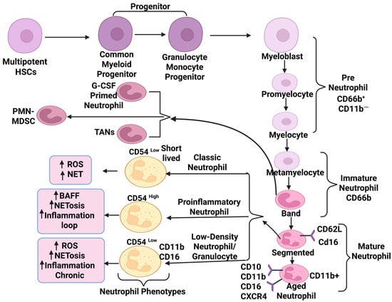 Beyond the surface marker subsets, neutrophils are classified into functionally distinct populations; for example, classic neutrophils, low-density neutrophils (LDNs), tumor-associated neutrophils (TANs), and G-CSF-primed neutrophils. The classic neutrophils are known for their innate immune response against microbial infections. They eliminate pathogens via phagocytosis of bacterial cells, liberation of antimicrobial peptides, and ROS production. LDNs are a neutrophil subtype observed in the peripheral blood of patients diagnosed with conditions like cancer, autoimmune diseases, sepsis, and other inflammatory disorders. Their size and density are less than those of classic neutrophils. These cells are known for suppressing T cell responses and tumor promotion. Importantly, LDN’s population coexists with immature MDSCs (myeloid-derived suppressor cells; PMN-MDSCs) and mature cells []. CD11b and CD16 are common markers of LDNs (Figure 1). CD36, CD41, CD61, and CD226 upregulated on LDNs associated with non-small-cell lung cancer (NSCLC) [] and CD10, CD16, and CD45high present a mature phenotype with T cell-suppressive role in blood cancer []. Elevated NETosis is one of the functional features of LDNs or low-density granulocytes (LDGs) in SLE and severe inflammation. LDGs are also referred to as LDNs, a proinflammatory neutrophil subset that co-exists with peripheral blood mononuclear cells and separate during density gradient centrifugation in various immune-mediated diseases [].