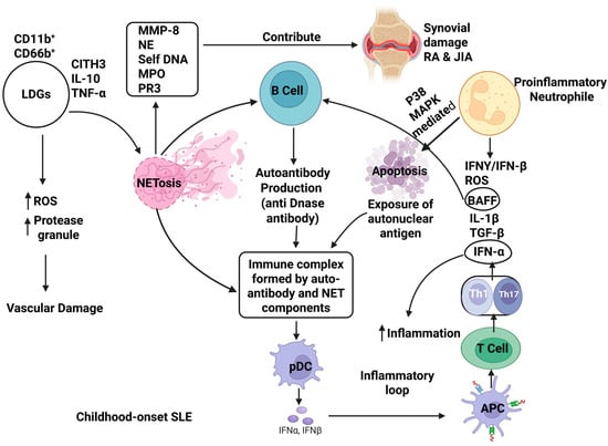 Dysregulated neutrophil subsets play a key role in pathogenesis of systemic lupus erythematosus due to their dysfunction such as ROS generation and granule proteases release that results in vascular tissue damage and trigger NET formation simultaneously. NETs expose neoepitopes, to which immune cells bind, these may nuclear autoantigens such as double-stranded DNA and modified histones. These antigen-specific peptides bind to B cell receptors (BCR) and stimulate the autoantibody production, including anti-dsDNA and anti-histone antibodies, followed by B cell activation, regulated by B cell-activating factor (BAFF) and interferons (IFNs) that sustain autoimmunity. In maintaining homeostasis, neutrophils undergo spontaneous apoptosis, but this process can be accelerated. Enhanced neutrophil apoptosis increases the apoptotic burden, generating antinuclear autoantibodies. Dysregulated NETs released by neutrophils also secrete proinflammatory mediators that recruit other immune cells to contribute tissue damage and a prominent subset of neutrophils in chronic inflammation called proinflammatory neutrophils [,]. Through the diverse subsets of neutrophils, LDGs expand significantly in SLE and are characterized by a distinct proinflammatory phenotype. Recently, Saisorn et al. reported highly CD66b-expressing LDGs that upregulate adhesion, NET formation, and apoptosis during lupus pathogenesis. In addition, the serum levels of IL-10 and TNF-α are significantly elevated in the patients suffering from childhood-onset SLE. Additionally, the presence of extracellular traps (ETs) and serum citrullinated histone H3 (CitH3) in LDGs compared to healthy controls may serve as practical biomarkers for disease severity. NETs act as potent autoantigens, capable of triggering autoantibody production and driving a robust type I interferon response that defines the feature of childhood-onset SLE immunopathology (Figure 2) []. Similarly, another study explains that LDGs are characterized by spontaneous NETosis, upregulated expression of type I interferon (IFN)-stimulated genes, and metabolic dysregulation, including impaired redox capacity. This dysregulation exacerbates ROS-mediated tissue damage and accelerates disease severity [,]. For example, LDGs show increased interferon-stimulated protein level and altered phosphorylation of cytoskeletal regulators in SLE that dysregulate cellular trafficking and encourage retention within lung and vascular tissues. Biomechanically, LDGs exhibit rougher cell surfaces, and membrane perturbations are independent of immune complex exposure, suggesting that intrinsic cellular abnormalities and microvascular injury can be used as a retention marker in future [].