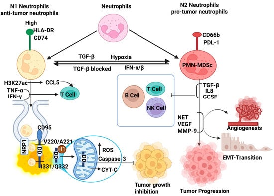 Transforming growth factor-beta (TGF-β) is reported as a switch to neutrophil phenotypic shift. TGF-β supports the pro-tumor N2 polarization by promoting angiogenesis through VEGF secretion, enhancing metastatic potential, and suppressing immune activation by upregulating PD-L1 expression, ultimately establishing an immunosuppressive tumor niche [].