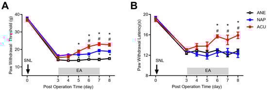 Electroacupuncture (EA) alleviates mechanical allodynia and thermal hyperalgesia following spinal nerve ligation (SNL). (A) Paw withdrawal threshold (PWT) was measured by a Dynamic Plantar Aesthesiometer. (B) Paw withdrawal latency (PWL) measured with a plantar test apparatus. Both PWT and PWL were significantly improved in the EA-treated (ACU) group compared with the anesthetized control (ANE) and non-acupoint stimulation (NAP) groups. NAP stimulation modestly increased PWT but did not affect PWL. Data are presented as mean ± SEM (n = 9 per group). * p < 0.05 vs. ANE; # p < 0.05 vs. NAP.