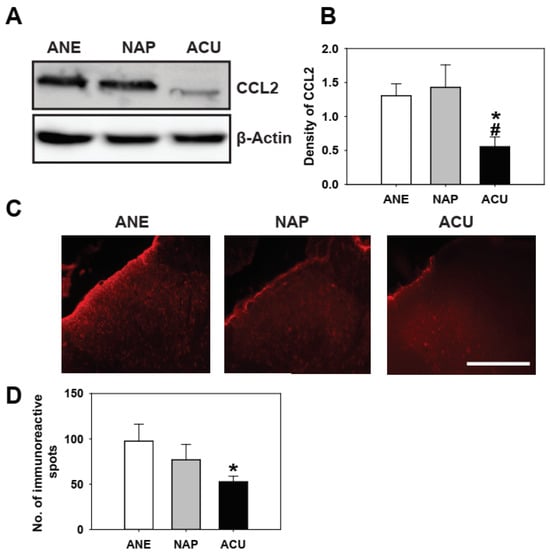 Five rats from ANE, NAP and ACU groups were deeply anesthetized with pentobarbital and euthanized. L4–L6 spinal cord segments were collected, homogenized in lysis buffer, and centrifuged. Protein concentrations were determined using a Bradford assay. Equal amounts of protein (40 μg) were separated by SDS-PAGE, transferred to nitrocellulose membranes, and blocked with 5% bovine serum albumin (BSA) in TBST. Membranes were incubated overnight at 4 °C with primary antibodies against CCL2 (ThermoFischer, Waltham, MA, USA, #PA534505, 1:500), IL-1β (Abcam, Cambridge, UK, #ab9787, 1:2500), TNF-α (Abcam, Cambridge, UK, #ab9755, 1:2500), and CCR2 (ThermFischer, Waltham, MA, USA, #PA523042, 1:1000). After washing, membranes were incubated with HRP-conjugated secondary antibody (1:2000, Abcam) for 1.5 h at room temperature. Bands were visualized using a CCD imaging system (ImageQuant LAS 4000, Fujifilm, Tokyo, Japan) and quantified with ImageJ software 1.52a (NIH, Bethesda, MD, USA).