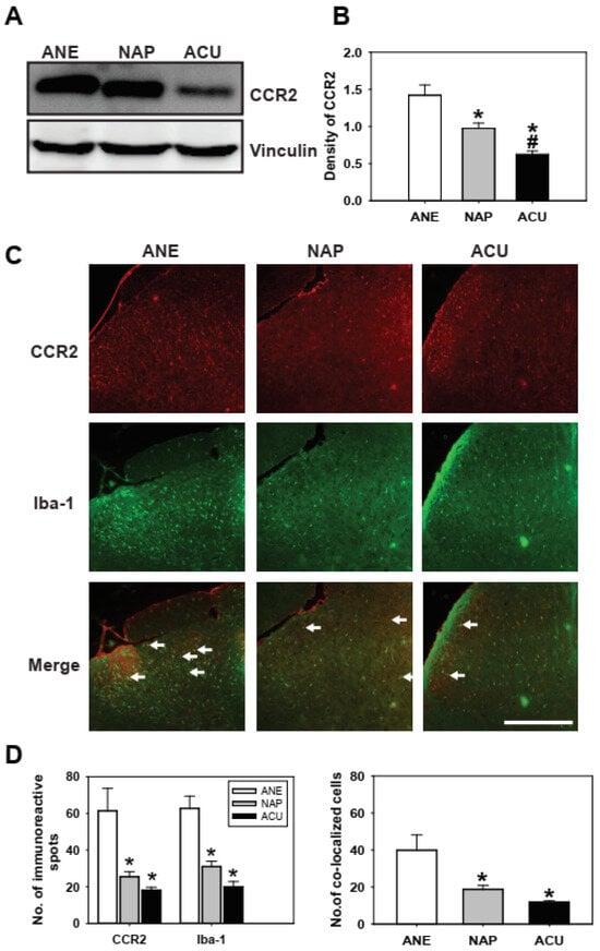 EA significantly attenuated this activation. As shown in Figure 3, EA at ST36 and GB34 (ACU group) significantly decreased CCR2 protein expression compared with the ANE and NAP groups. Immunofluorescence analysis further revealed that EA reduced the number of CCR2- and Iba-1-positive cells, as well as CCR2/Iba-1 co-localized microglia, relative to both control groups. To further validate these findings, we performed high-magnification imaging of CCR2/Iba-1 immunofluorescence. As shown in Supplementary Figure S3, CCR2 intensity and CCR2/Iba-1 co-localization were markedly increased in the ANE and NAP groups, whereas EA treatment substantially reduced both CCR2 immunoreactivity and its overlap with microglia. These higher-resolution data corroborate the quantitative analyses presented in Figure 3, confirming that EA effectively suppresses CCR2-driven microglial activation in the spinal dorsal horn.