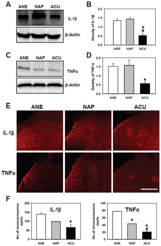 Electroacupuncture (EA) suppresses IL-1β and TNF-α expression in the spinal dorsal horn of rats with neuropathic pain. (A,C) Representative Western blot images and (B,D) quantification of IL-1β and TNF-α protein levels in the L4-L6 spinal dorsal horn from the anesthetized control (ANE), non-acupoint stimulation (NAP), and EA (ACU) groups. EA significantly decreased IL-1β and TNF-α expression compared with ANE, and also reduced IL-1β levels compared with NAP. (E) Representative immunofluorescence images and (F) quantification of IL-1β- and TNF-α-positive cells, showing that EA markedly reduced pro-inflammatory cytokine expression in the dorsal horn. Scale bar = 100 μm. Data are presented as mean ± SEM (n = 5 per group for Western blot, n = 4 per group for immunofluorescence). * p < 0.05 vs. ANE; # p < 0.05 vs. NAP.