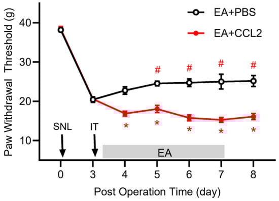Intrathecal administration of CCL2 abolishes the analgesic effects of electroacupuncture in rats with spinal nerve ligation (SNL). Three days after SNL surgery, CCL2 or PBS was injected intrathecally. Paw withdrawal threshold (PWT) was measured in the both groups. EA significantly increased the PWT in the EA+PBS group compared with pre-EA stimulation baseline (# p < 0.05). However, intrathecal CCL2 injection abolished EA’s analgesic effect, as indicated by significantly reduced PWT in the EA+CCL2 group compared with the EA+PBS group (* p < 0.05). Data are presented as mean ± SEM (n = 8 per group).