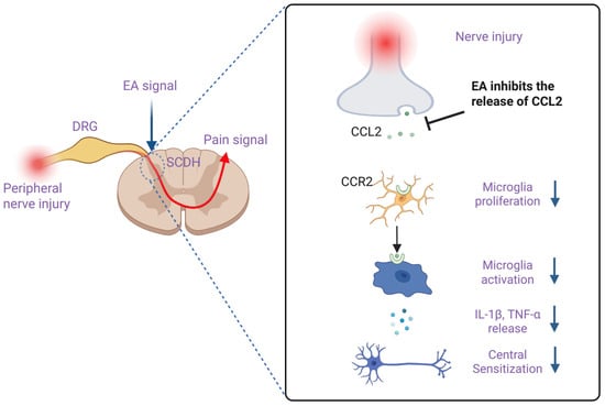 The many interrelated pathways that affect both the central and peripheral pain processing systems are probably involved in the mechanisms by which EA inhibits the expression of spinal CCL2. The rostral ventromedial medulla and periaqueductal gray are two brainstem nuclei that can directly inhibit spinal microglial activation through noradrenergic and serotonergic projections. By activating descending inhibitory pathways [,], EA stimulation at particular acupoints may suppress CCL2 release. As these neuromodulators have been demonstrated to directly reduce inflammation in glial cells, EA-induced release of endogenous opioids and adenosine at the peripheral and spinal levels [,] may also aid in CCL2 suppression. EA’s effects on CCL2/CCR2 signaling appear to involve both local mechanisms at the acupoint level and central mechanisms within the spinal cord, as evidenced by the point specificity found in our study, where EA at acupoints ST36 and GB34 was more effective than non-acupoint stimulation. By acting as a local anti-inflammatory, peripheral EA stimulation may lessen primary afferent input, which in turn may lessen the neuronal hyperactivity that produces CCL2 in microglia. In addition to merely deactivating microglia, inhibiting CCL2/CCR2 signaling has a cascading effect on the maintenance of chronic pain states by coordinating a complex inflammatory network that includes astrocytes, infiltrating immune cells, and synaptic plasticity mechanisms. The proposed mechanism is summarized in Figure 6.