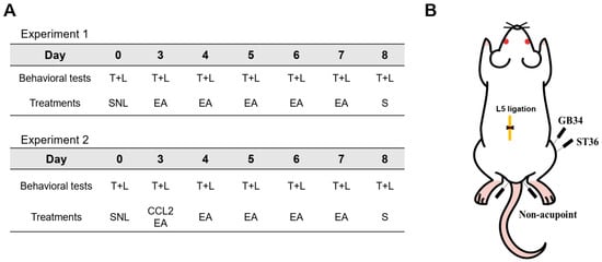 Experimental timeline and acupoint locations. (A) Schematic timeline of experimental procedures. In Experiment 1, rats underwent L5 spinal nerve ligation (SNL) on day 0 and received electroacupuncture (EA) at ST36 and GB34 once daily from postoperative day 3 to 7. Behavioral assessments of thermal hyperalgesia (T) and mechanical allodynia (L) were conducted on days 0, 3–8. On day 8, L4–L6 spinal cord segments (S) were collected for molecular analyses. In Experiment 2, rats received intrathecal CCL2 injection on day 3 following SNL, in addition to EA treatment from day 3 to 7. Behavioral assessments and tissue collection were performed as in Experiment 1. (B) Diagram of acupoint locations and surgical site. EA was applied at ST36 and GB34. A non-acupoint site near the base of the tail was used as a control. The site of L5 spinal nerve ligation is indicated.