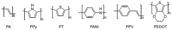 - Folorunso, O.; Olukanmi, P.; Thokozani, S. Conductive polymers’ electronic structure modification for multifunctional applications. Mater. Today Commun. 2023, 35, 106308. [Google Scholar] [CrossRef]