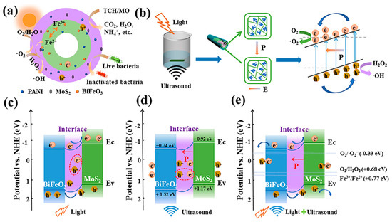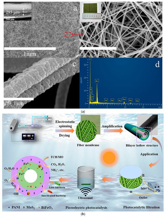 - Lin, L.; He, Q.; Chen, Y.; Wang, B.; Zhang, L.; Dai, X.; Jiang, Y.; Chen, H.; Liao, J.; Mao, Y.; et al. MoS2/polyaniline (PANI)/polyacrylonitrile (PAN)@BiFeO3 bilayer hollow nanofiber membrane: Photocatalytic filtration and piezoelectric effect enhancing degradation and disinfection. J. Colloid Interface Sci. 2023, 644, 29–41. [Google Scholar] [CrossRef]