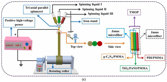| g-C3N4/PMMA/TiO2/PANI/PMMA/self-assembled 3,4,9,10-PDI/PMMA tricolor-typed microfiber oriented-heterostructure photocatalyst (TMOP) | Voltage, flow rate, and the distance from the tip of the needle were: 10 kV, 0.8 mL h−1, and 15 cm; Rotation rate: 700 rpm | g-C3N4/PMMA (MP1); TiO2/PANI/PMMA (MP2); PDI/PMMA (MP3) (triaxial parallel electrospinning); TiO2 amount varied: 0.320 g, 0.480 g, and 0.640 g | CIP, TCH, chlortetracycline hydrochloride (CTC), levofloxacin (LEV), and MB | Simulated sunlight | Degradation rates: 88.99% for CIP within 90 min, 91.15% for TCH within 80 min, 77.55% for CTC within 150 min, 69.51% for LEV within 150 min, and 92.50% for MB within 50 min | [94] |