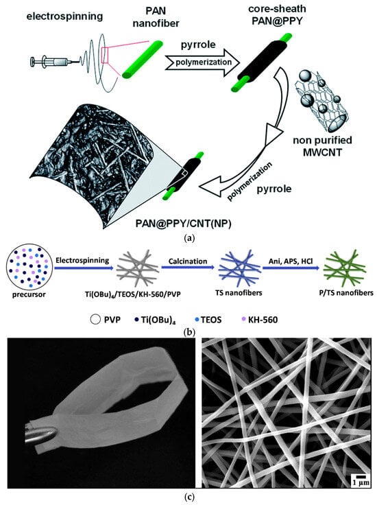 - Wang, X.; Yu, G.; Zhang, J.; Yu, M.; Ramakrishna, S.; Long, Y. Conductive polymer ultrafine fibers via electrospinning: Preparation, physical properties and applications. Prog. Mater. Sci. 2021, 115, 100704. [Google Scholar] [CrossRef]
