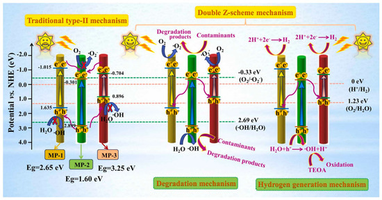 - Sun, F.; Xie, Y.; Xu, D.; Liu, F.; Qi, H.; Ma, Q.; Yang, Y.; Yu, H.; Yu, W.; Dong, X. Electrospun self-supporting double Z-scheme tricolor-typed microfiber oriented-heterostructure photocatalyst with highly effective hydrogen evolution and organic pollutants degradation. J. Environ. Chem. Eng. 2023, 11, 109169. [Google Scholar] [CrossRef]