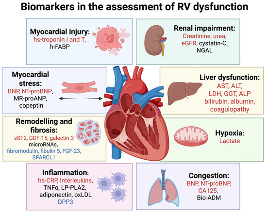 Right ventricular (RV) dysfunction is common across different clinical settings and associated with the more severe clinical presentation, greater arrhythmic propensity, worse functional status, and higher risk of hospitalisation for heart failure (HF) and mortality [1,2,3]. The presence of RV dysfunction may hamper the tolerance of guideline-directed medical therapies (GDMT) for HF, and thus impact the clinical outcomes [4]. Despite its clinical and prognostic significance, RV dysfunction frequently remains overlooked, and its timely diagnosis remains a challenge. Current diagnostic strategies principally rely on imaging and invasive assessments [5]. Laboratory biomarkers offer rapid, reliable, and non-invasive tools that can be used in diagnostic assessment, risk stratification, prognostication and management of RV failure. Cardiac troponins and natriuretic peptides remain the most widely used biomarkers. However, growing interest is being directed towards novel biomarkers that capture diverse aspects of RV pathophysiology and its systemic consequences (e.g., carbohydrate antigen 125 (CA125) heart type fatty acid–binding protein (hFABP), growth differentiation factor 15 (GDF15), galectin-3 etc.) [6]. The present review aims to address the key aspects of the pathophysiology, clinical presentation, diagnosis, and management of RV dysfunction, with a focus on the role of the established and emerging biomarkers in the evaluation and treatment of RV dysfunction in different clinical situations.