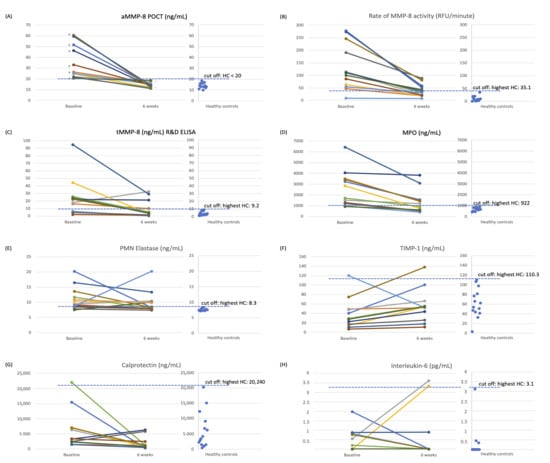 Treatment effect monitoring by oral fluid biomarkers: In the figure, the various colors correspond to different individual patient samples. (A) aMMP-8 POCT (ng/mL) (PerioSafe/Oralyzer) with cut-off 20 ng/mL (test positive, +, ≥20 ng/mL; test negative, −, <20 ng/mL), (B) rate of MMP-8 activity (RFU/minute), (C) tMMP-8 (ng/mL) (R&D systems ELISA), (D) MPO (ng/mL), (E) PMN Elastase (ng/mL), (F) TIMP-1 (ng/mL), (G) Calprotectin (ng/mL), and (H) Interleukin-6 (ng/mL) compared to the highest value of the healthy controls (3rd-year dental students (HCs). According to Aji et al. [22], 13 adult patients with chronic stage III/IV grade B/C periodontitis were treated by non-surgical periodontal treatment and were compared to 13 systematically and periodontally healthy controls (HCs) [22]. This was an observational study.