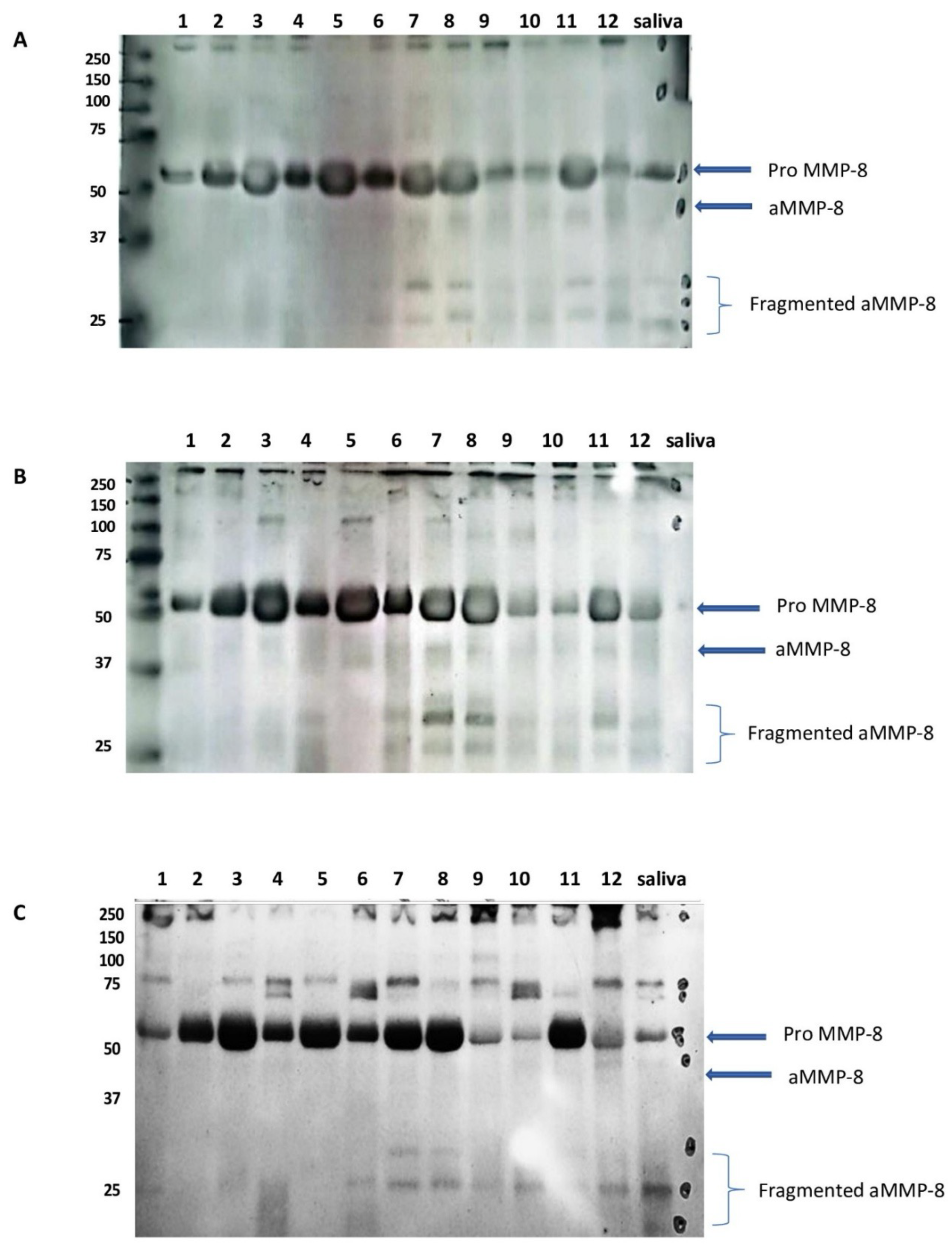 Figure 1. (A,B) Western immunoblot analysis using MMP-8 monoclonal antibodies; (C) Western blot analysis used polyclonal antibodies. This figure shows that healthy samples (lanes 1–6) show intact pro-latent total collagenase (pro MMP-8), and periodontitis stage III/IV-grade B/C samples (lanes 7–12) reveal activated collagenase (aMMP-8) that concomitantly also fragmented to lower molecular species, without exception. Healthy control saliva is a positive control (lane saliva). Molecular weight markers’ mobilities are shown on the left. This was an observational study.