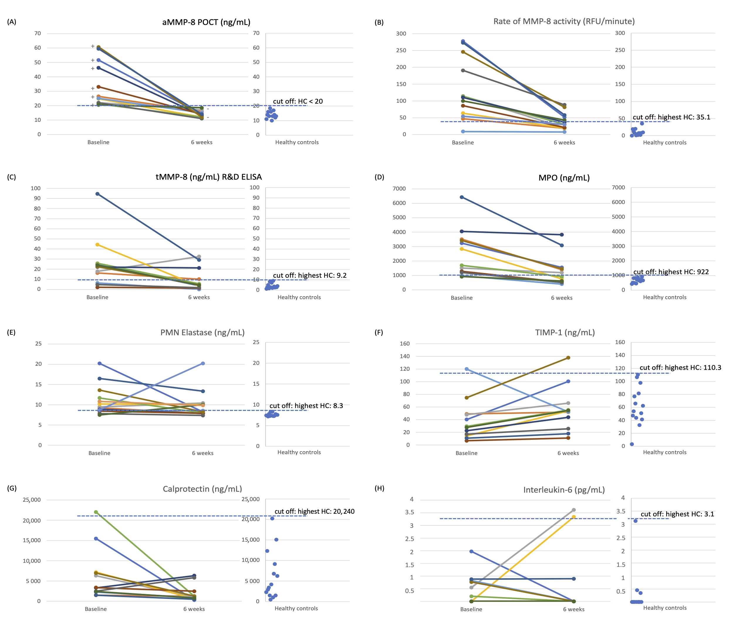 Figure 2. Treatment effect monitoring by oral fluid biomarkers: In the figure, the various colors correspond to different individual patient samples. (A) aMMP-8 POCT (ng/mL) (PerioSafe/Oralyzer) with cut-off 20 ng/mL (test positive, +, ≥20 ng/mL; test negative, −, <20 ng/mL), (B) rate of MMP-8 activity (RFU/minute), (C) tMMP-8 (ng/mL) (R&D systems ELISA), (D) MPO (ng/mL), (E) PMN Elastase (ng/mL), (F) TIMP-1 (ng/mL), (G) Calprotectin (ng/mL), and (H) Interleukin-6 (ng/mL) compared to the highest value of the healthy controls (3rd-year dental students (HCs). According to Aji et al. [22], 13 adult patients with chronic stage III/IV grade B/C periodontitis were treated by non-surgical periodontal treatment and were compared to 13 systematically and periodontally healthy controls (HCs) [22]. This was an observational study.