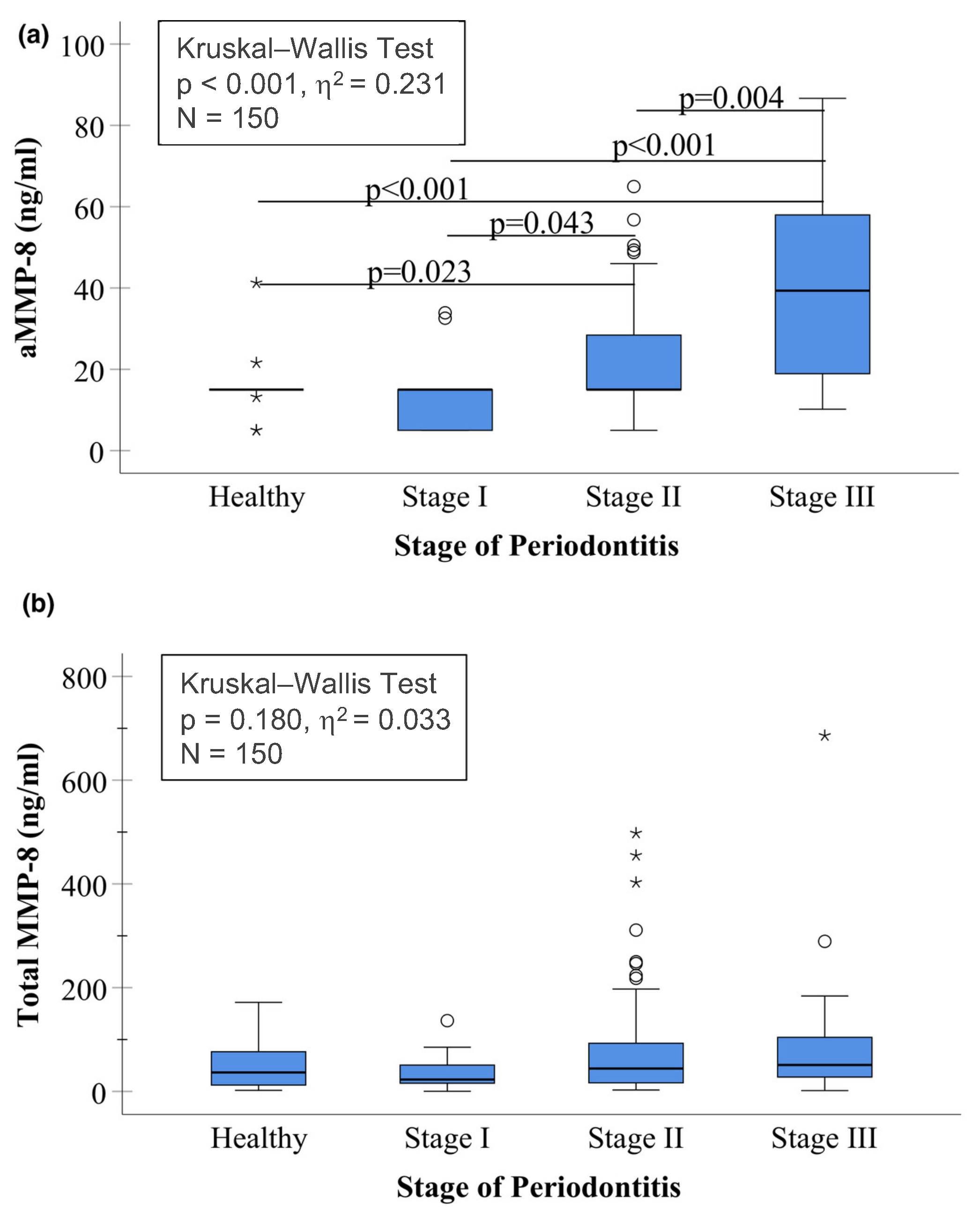 Figure 3. Box plot of concentrations of (a) active MMP-8 (aMMP-8) measured by quantitative lateral flow mouth rinse point-of-care technology (POCT) (PerioSafe/ORALyzer combination) and (b) total (latent and active) salivary MMP-8 measured by ELISA, Quantikine, R&D Systems, categorized by stage of periodontitis in 150 Greek adults, as described previously [35]. The asterisk (*) indicates outliers of more than 3 times the interquartile range and the circle (○) indicates outliers between 1.5–3 times the interquartile range in the data. This figure is reproduced under the terms and conditions of the Creative Commons Attribution (CC BY) license https://creativecommons.org/licenses/by/4.0/ (accessed on 4 September 2025) [35].