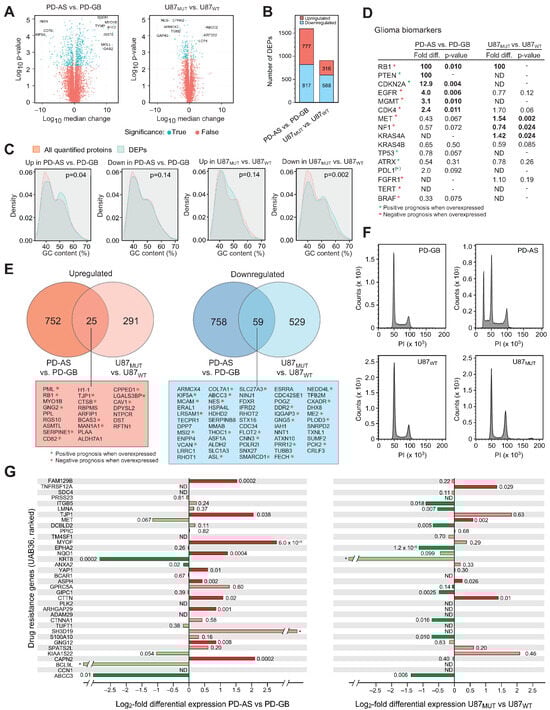 Differentially expressed proteins in the IDH1 mutant PD-AS and U87MUT cells compared to their IDH1 wild-type counterparts. (A) Volcano plots of DEPs in PD-AS vs. PD-GB (left panel) and U87MUT vs. U87WT (right panel). (B) The number of up- and downregulated DEPs in PD-AS vs. PD-GB and in U87MUT vs. U87WT. (C) ShinyGO analysis of the GC-content of the genes encoding DEPs compared to the genes encoding all quantified proteins in the dataset. (D) Expression of proteins commonly used as prognostic and/or therapeutic biomarkers in glioma. ND: Not detected. Green stars represent positive prognosis when overexpressed, red stars represent negative prognosis when overexpressed. (E) Venn diagrams illustrating common up- and downregulated DEPs in the two model systems. Common DEPs are listed in the bottom boxes, ranging from most upregulated (red box) to most downregulated (blue box). Green stars represent positive prognosis when overexpressed, red stars represent negative prognosis when overexpressed. (F) Cell cycle analysis of freely cycling PD-GB and PD-AS cells (upper panels) and U87WT and U87MUT cells (bottom panels). (G) The majority of the DEPs encoded by the drug resistance genes in the UAB36 panel were upregulated in the IDH1 mutant PD-AS cells compared to IDH wild-type PD-GB, whereas most of the UAB36 genes were downregulated in U87MUT vs. U87WT. *; detected only in one of the cell pairs, thus reported as non-significant.