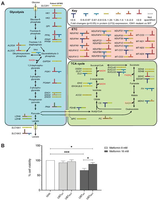 Opposite metabolic shifts and drug resistance profiles observed in PD-AS vs. PD-GB compared to U87MUT vs. U87WT. (A) Whereas the IDH1-mutant PD-AS displayed a marked upregulation of glycolytic enzymes and downregulation of ETC proteins compared to PD-GB, the U87MUT cells had downregulated or unchanged glycolytic enzymes and overall upregulated ETC proteins compared to U87WT. (B) The Complex I inhibitor metformin was significantly more cytotoxic to U87WT than to U87MUT. Statistical significance was calculated using one-way ANOVA followed by Turkey post hoc test ( * p = 0.01–0.05; *** p = 0.0001–0.001).