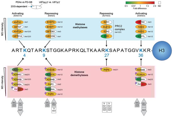The IDH1-mutant glioma cells harbor distinct expression of proteins regulating histone lysine methylation. Histone lysine methyltransferases (KMTs) detected in our datasets are shown in the blue box (ranked after MS intensities in PD-AS) and pointing to their respective lysine targets in Histone H3. Likewise, histone lysine demethylases (KDMs) are shown in the pink box, below their lysine targets. A filled blue circle indicates that the KDM is 2OG-dependent and thus should be inhibited in the IDH1-mutant cells. The color bar at the top right indicates fold change in expression in the IDH-mutant cells vs. their IDH wild-type counterparts.
