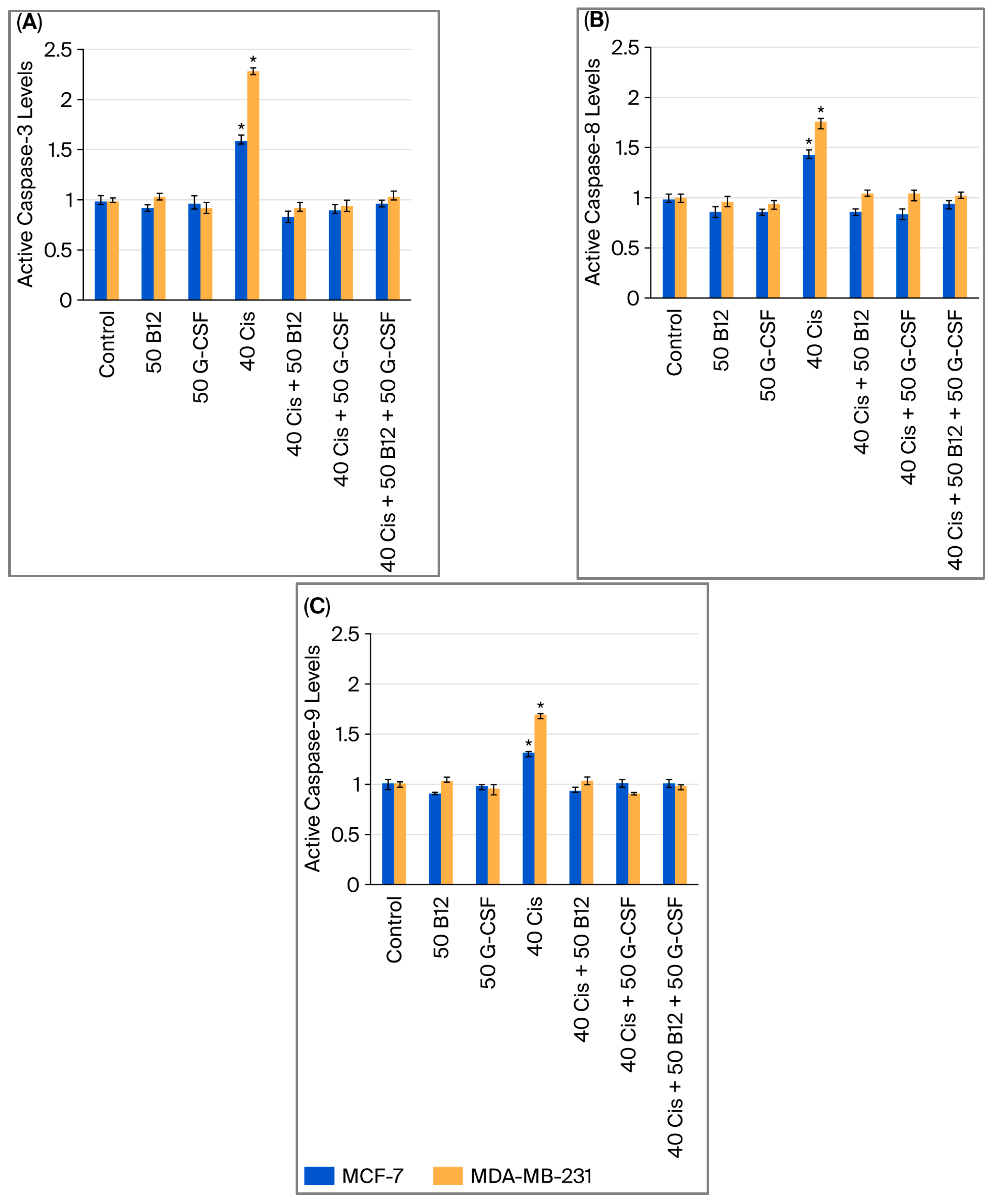 2.4. Effects of Vitamin B12 and G-CSF on Cisplatin-Induced Caspase Activation
