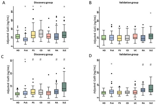 Gal1 and Gal9 plasma levels across IMIDs and HD in the discovery (A,C) and validation (B,D) populations. Values of Gal1 and Gal9 plasma levels were adjusted for frozen storage time, age, sex, and inter-assay variability (plate). Data are shown as box plots in which the line in the box represents the median, and the box edges represent the interquartile range. Whiskers represent the 5th and 95th percentiles. Dots indicate outliers. The Mann–Whitney test was used to determine significant differences with respect to HD. Due to multiple comparisons, the level of significance was set at p < 0.008 (* p > 0.008 to <0.05; # p < 0.008). Abbreviations: CD: Crohn’s disease; Gal1: galectin 1; Gal9: galectin 9; HD: healthy donors; IMIDs: immune-mediated inflammatory diseases; PS: psoriasis; PsA: psoriatic arthritis; RA: rheumatoid arthritis. SLE: systemic lupus erythematosus; UC: ulcerative colitis.