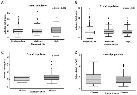 Gal1 and Gal9 plasma levels according to disease activity category (A,B) and disease duration (C,D) in patients with immune-mediated inflammatory diseases. Box plots show the interquartile range (IQR; box edges = 25th to 75th percentile, midline = median), and whiskers represent the 5th and 95th percentiles. Dots indicate outliers. Values for Gal1 and Gal9 plasma levels were predicted from multivariable linear regression models adjusted for frozen storage time, age, sex, and inter-assay variability (plate). Statistical significance was determined by Cuzick’s test (panels A,B) and the Mann–Whitney test (panels C,D); significance level was set at p < 0.05. Abbreviations: CD: Crohn’s disease; Gal1: galectin 1; Gal9: galectin 9.