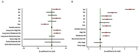 Variables associated with Gal1 and Gal9 plasma levels. Data represent de β coefficients (dots) and the 95% confidence interval (black line) obtained in multivariable linear regression models assessing the association between plasma levels of Gal1 (A) and Gal9 (B) and the following variables: diagnosis (HD (refence), SLE, RA, UC, CD, PS, PsA), disease activity (high, moderate, remission/low), and disease duration (early vs. late-stage). Black dots represent the reference condition of each variable, gray dots represent non-significant conditions, and red dots significant conditions. (See Supplementary Tables S3 and S4 and Methods section for further information). Abbreviations: CD: Crohn’s disease; DA: disease activity; Gal1: galectin-1; Gal9: galectin-9; PS: psoriasis; PsA: psoriatic arthritis; RA: rheumatoid arthritis. SLE: systemic lupus erythematosus; UC: ulcerative colitis.
