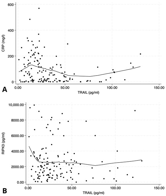 Scatter plots illustrating the relationship between TNF-related apoptosis-inducing ligand (TRAIL) and inflammatory/necroptosis markers. (A) Negative correlation between TRAIL and C-reactive protein (CRP); Spearman’s ρ = −0.20, p < 0.05. (B) No significant correlation between TRAIL and receptor-interacting protein kinase-3 (RIPK3); Spearman’s ρ = 0.04, p = 0.7. Data are displayed with LOWESS-smoothed trend lines to highlight potential non-linear patterns.